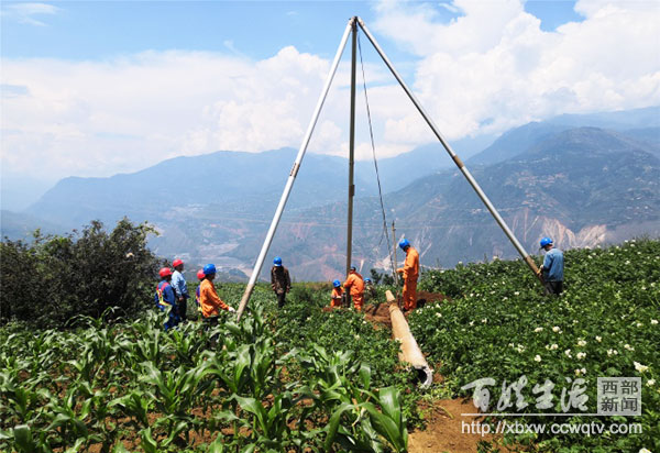 在现场施工中,党员们克服山高路陡、环境恶劣,交通不便等困难,采用人力转运电杆、导线等物资,有时为运送一根电杆需要十几个人肩扛手抬花十几个小时才能送到位。