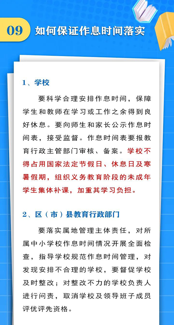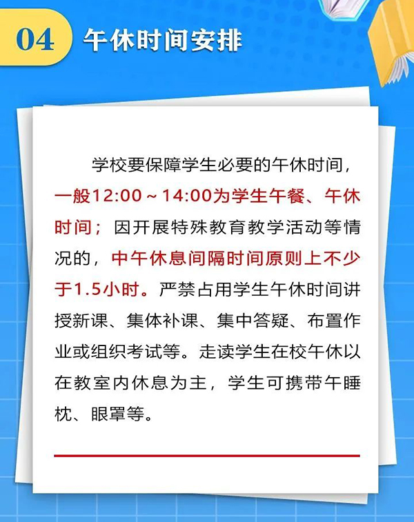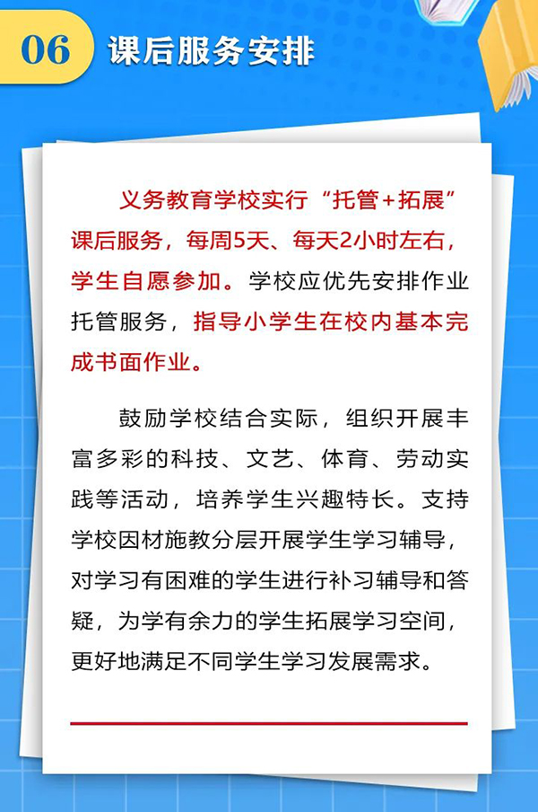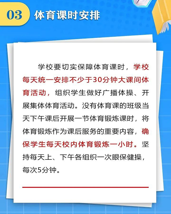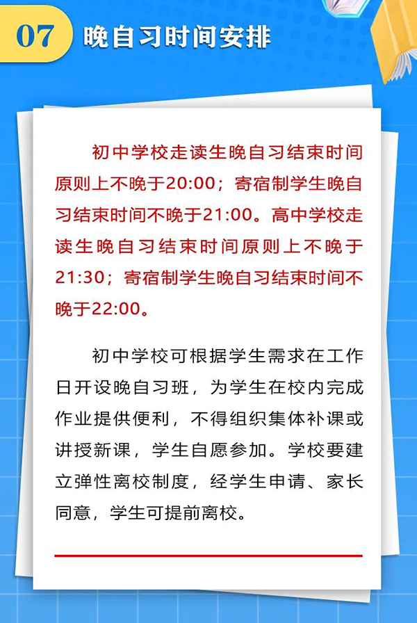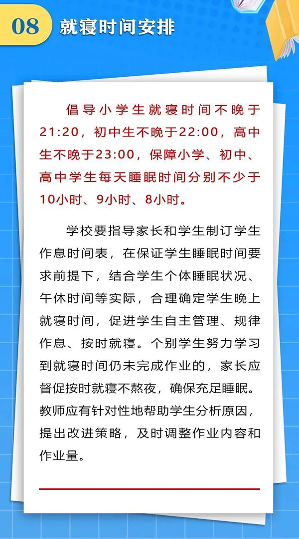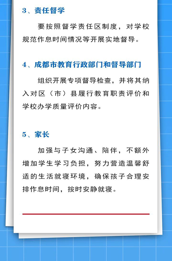 近日,成都市结合党中央、国务院和省委、省政府有关“双减”文件精神和“五项管理”要求,下发了《关于合理安排作息时间促进中小学生健康成长的通知》,要求学校做好行课安排、午间休息、课后服务、就寝时间,把课余时间留给学生、把空间留给家庭、把作业留在学校,促进中小学生健康成长,受到社会广泛关注和普遍点赞。