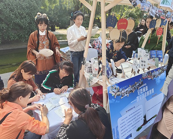 活动现场,青羊区社区教育与青少年服务中心推出的“全龄阅读——遇见诗歌的浪漫”主题临诗花笺互动活动,吸引了不少市民朋友驻足体验。在这里,你不仅可以吟诵诗词,还可以手握毛笔现场临摹,通过沉浸式的诗词共赏和展示,近距离感受千年前杜甫的诗意世界。
