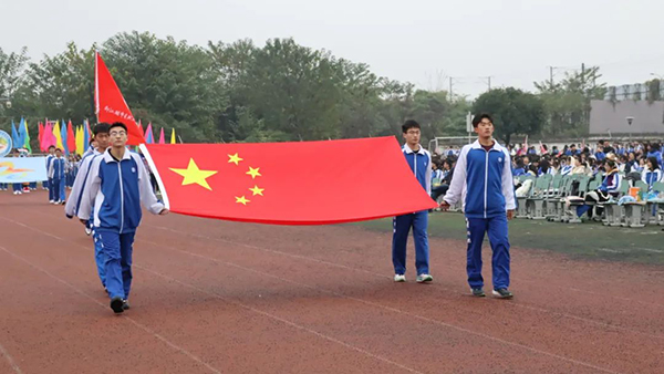 脚步庄严,国旗飞扬,在嘹亮的国歌声中,校运会火热进行中。