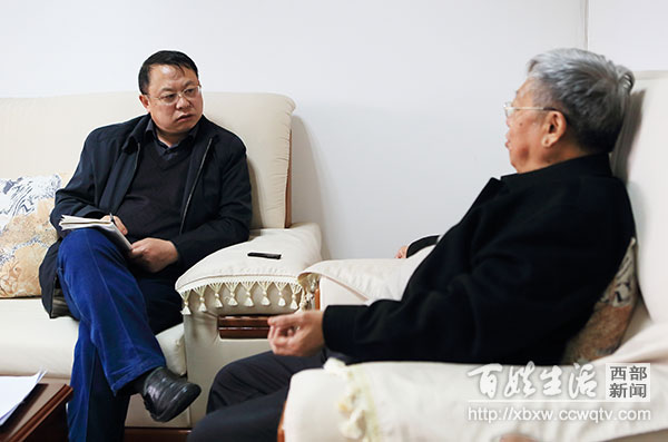 图为:贺贵成(左)采访老首长。