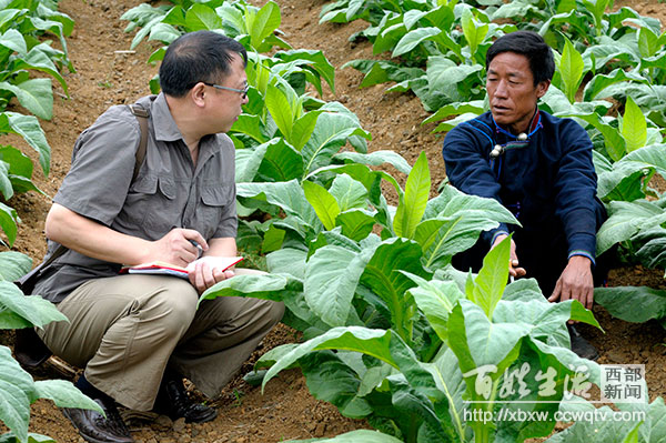 图为:贺贵成(左)了解民族地区生活情况。