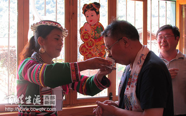 图为:美丽的藏族姑娘向贺贵成敬酒。