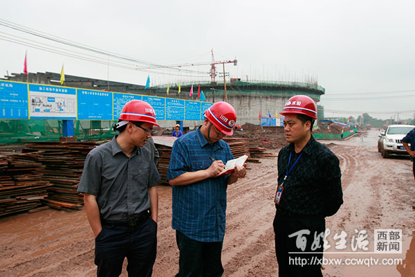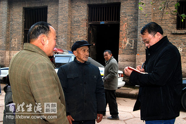图为:贺贵成(中)在施工工地采访。