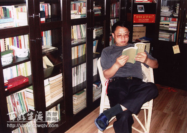 图为:贺贵成在家中书屋学习。