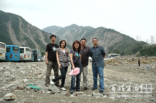 图为:10年前,贺贵成(右一)与同事在灾区的合影。