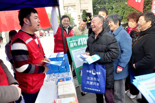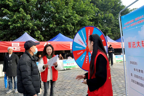 图为:开展宣传活动的志愿者向群众进行普法教育。