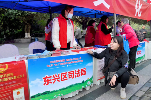 图为:东兴区司法局工作人员向群众解答有关法律问题。
