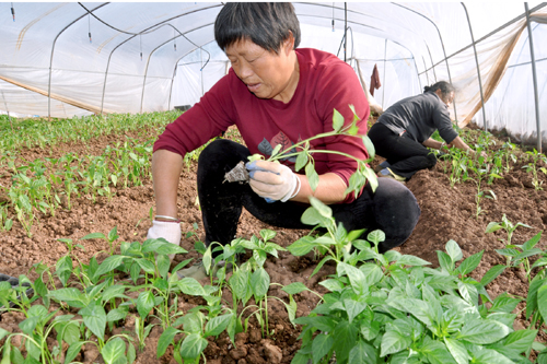 图为:村民们正在大棚里种植“二荆条”海椒秧。