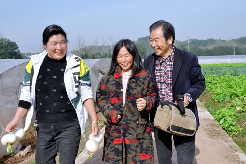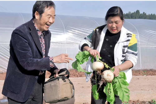 图为:旱地坝村党总支书记、主任李宗莲(右)向来宾介绍大白萝卜的种植情况