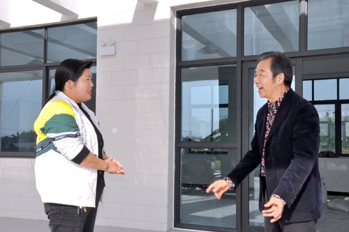 图为:李宗莲书记(左)向来宾接介绍村办公室的建设情况。