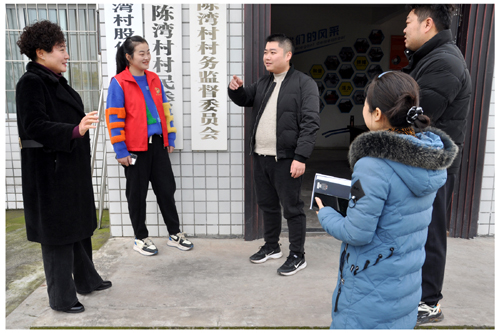 图为:村“两委”成员向来宾介绍陈湾村的经济发展情况。