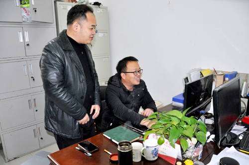 图为:驻村“第一书记”唐建(右)与村党委书记、主任周强在一起研究乡村振兴情况