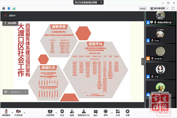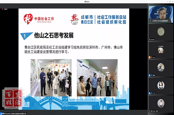 11月30日,“创新·发展·融合”成渝双城对话线上分享会在腾讯会议直播间顺利开展。来自重庆、成都两地的枢纽组织代表、社工站运营组织代表及其他社会组织代表近40人参与。