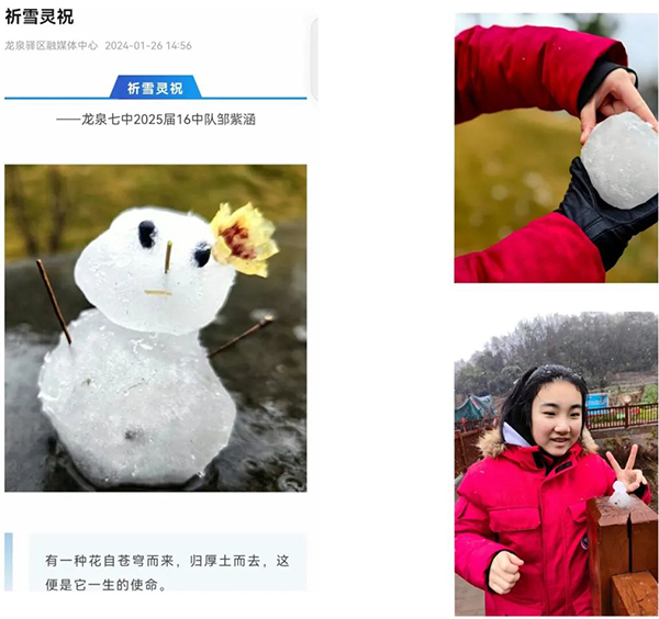 我满怀惊喜去观雪,晶莹的雪花好美。我就地取材,把冰晶滚成个大冰团,即兴制作了一个娇小可爱的小雪人儿。再即兴创作了一篇《祈雪灵祝》,上了龙泉驿区融媒体网,给大自然交了第一份儿寒假作业,好开心。