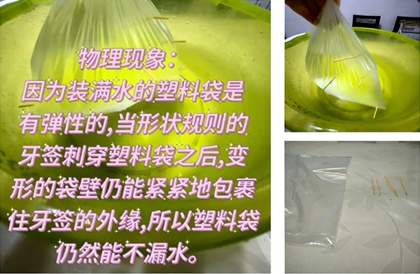 寒假,当然是探索知识的好时机。做一个物理小实验吧,把牙签扎进装满水的水袋也不会漏水,明白了“压力传递”的原理。探索无限,冲冲冲!
