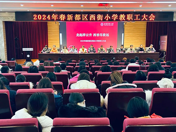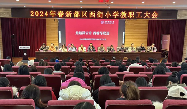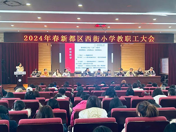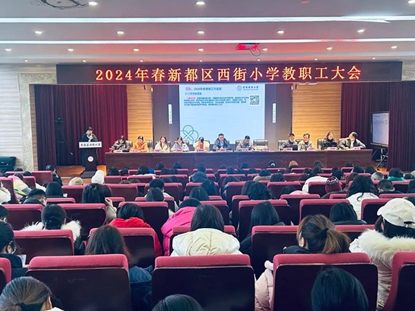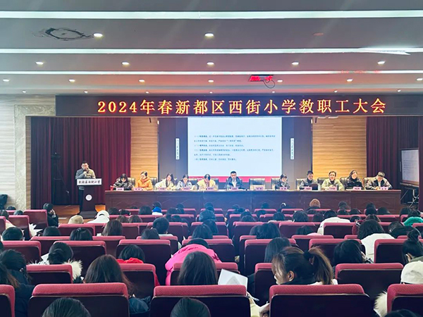 百姓生活讯 今年是全面贯彻落实党的二十大精神,建设教育强国关键的一年,也是新都区西街小学乘势而上继往开来的重要节点。为切实做好新学期各项工作,迎接新机遇面对新挑战;扎实做好开学前的各项准备工作,引领教职工明确新学期工作任务和发展方向,2024年2月23日,新都区西街小学在新城校区五楼多媒体教室召开2024年春季学期教职工大会。全体教职工齐聚一堂,开启新学期崭新的一页。会议由刘勇副校长主持。