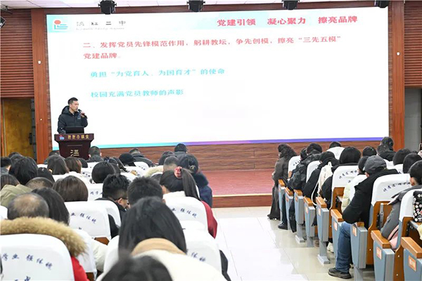 校长金忠在大会上围绕“办每一个学生都喜爱的学校”“让每一位老师都受到尊敬的学校”的目标对学校发展规划提出了要求。他指出学校发展的前提在全员育人体系,基础是良好的师生关系,动力是不断更新的理念,核心是进取有为的队伍建设,根本是教育教学质量提升,保障是符合新形势的制度建设。同时,金校长就学校良好的运转谈了自己的体会,他希望二中教育人不要做虚妄之人,要做谦逊之人,更要做有远大理想又绝对现实的教育人。
