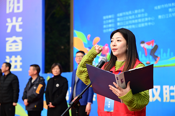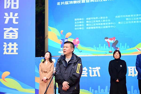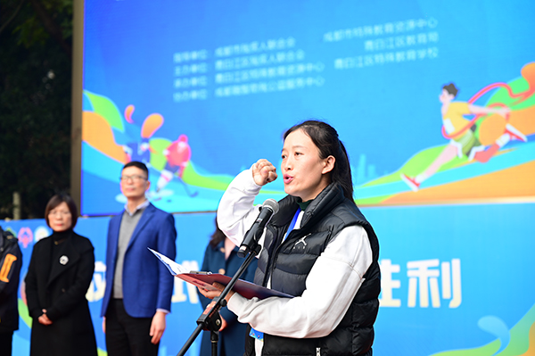 成都市残疾人联合会党组成员、副理事长钟兵宣布运动会开幕。