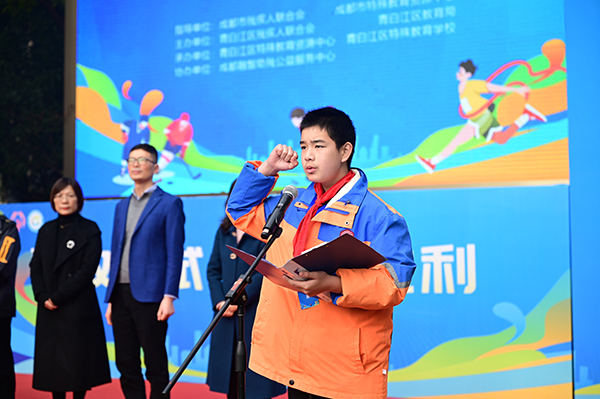 开赛仪式上裁判员、运动员、融合伙伴、志愿者代表进行庄严宣誓。