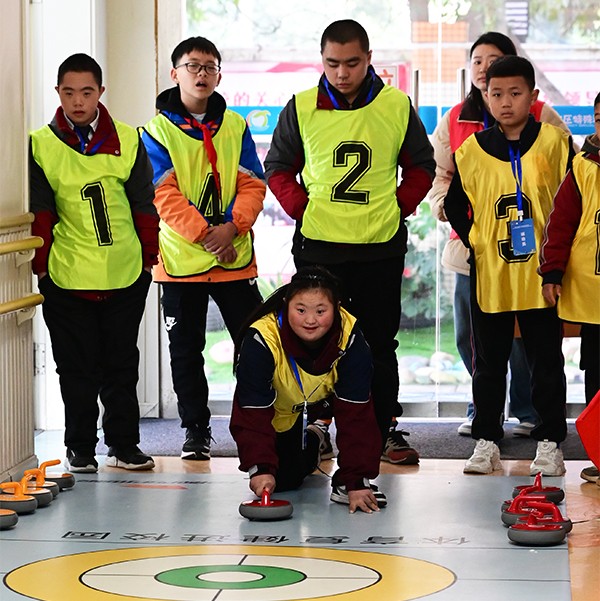 旱地冰壶运动健儿们在教练员的指导下,手握冰壶不慌张,屏气凝神、精准定位、巧力抛移。高手过招,既有竞争也有礼让,互相鼓励、和谐美好。比赛在孩子们激烈且友爱的角逐中落下帷幕,来自4个区县的孩子们用青春与热情、笑脸与活力、拼搏与汗水谱写出特奥比赛的美好华章。