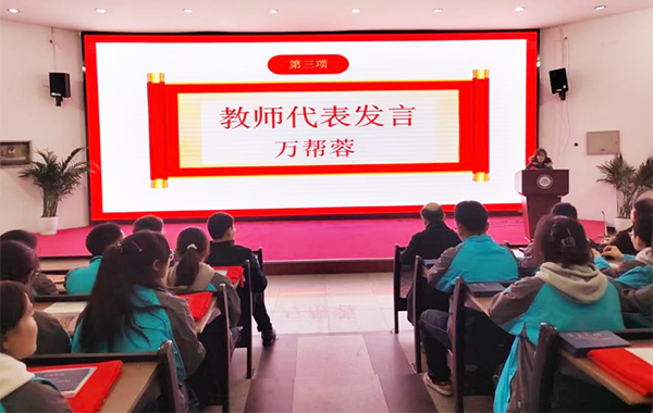 孜孜不倦育桃李,润物无声化春雨。万帮蓉老师作为高三教师代表发言,她首先表达了全体高三教师对同学们的祝福和期望。她说:“老师们是学生最坚实的后盾,老师们团结一心让学生在学习的道路上无所畏惧。”在成高这个温暖的大家庭中,师生共同进步用信念和毅力去面对学习过程中的挑战,6月定能摘得丰硕的果实。