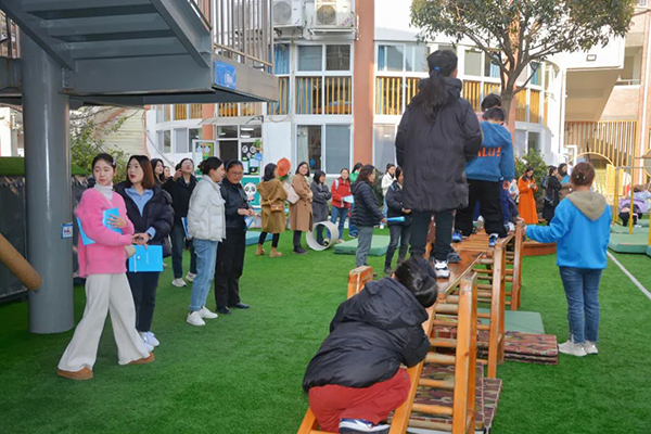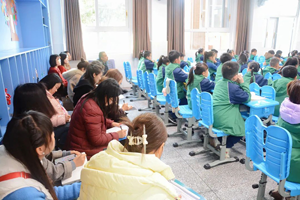参会人员走进灌州小学校的一年级课堂,融入小学上课的场景,也走进新欣幼儿园,观看幼儿园的户外体育活动,直观感受幼儿园和小学课堂活动的区别。