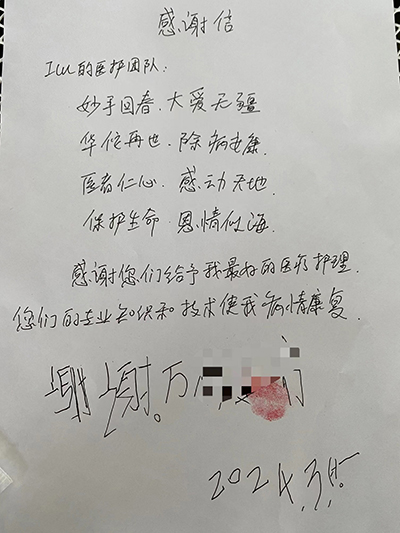 ——成都东部新区第二人民医院重症医学科收到一封来自患者的感谢信
