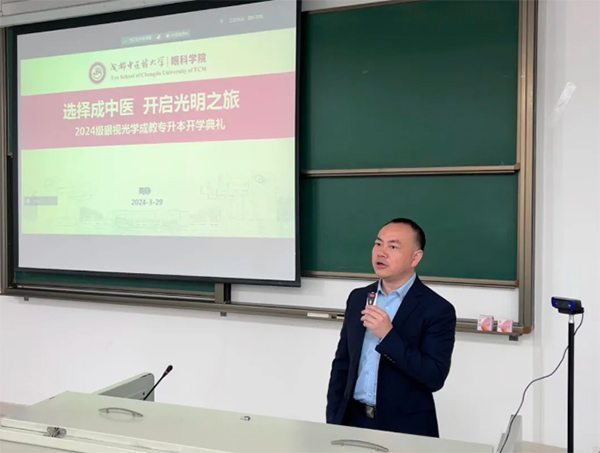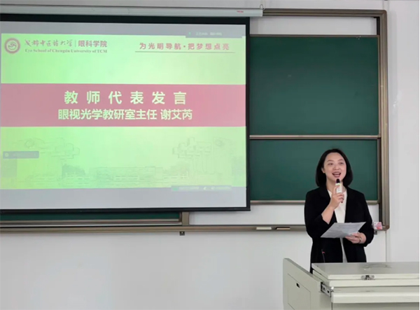 学院眼视光学教研室主任、附属银海眼科医院屈光眼肌科(小儿眼科)副主任谢艾芮副教授在发言中表示,新同学们在职学习的热情和决心值得肯定,大家相聚成中医既要提升学历,也要提升能力。学院眼视光学教研室将积极探索,不断创新,持续改进和完善培养方案,把最新最前沿的知识和技术传播给同学们。谢艾芮主任指出,眼视光行业正在快速发展,新技术新理念层出不穷,希望同学们保持对知识的热爱和追求,将理论与实践结合,不断提升自己的业务水平,用专业的知识服务更多人民群众。