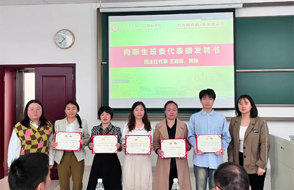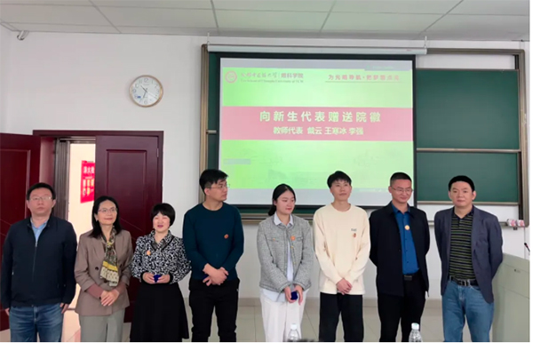 典礼上,学院教师代表戴云、王寒冰、李强分别向新生代表赠送佩戴了院徽,党委书记姚洪武宣布了新生班委聘任决定,新生班主任王蓉蓉、黄静向班委代表颁发了聘任书。