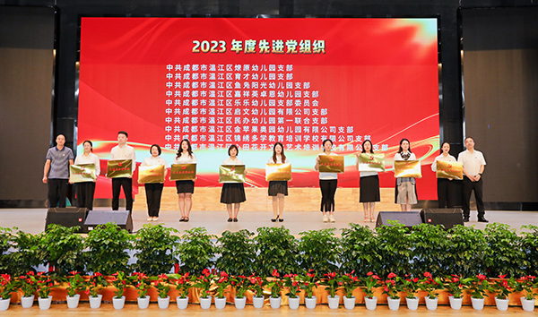 在颁奖环节,温江区教育系统党工委副书记、区教育局党组成员、机关党委书记丁宁波;温江区教育局党组成员、副局长张冬为获得“先进基层党组织”的单位颁发了奖牌,温江区教育局机关党委副书记郭傧、温江区教育局民职教科负责人祝华斌、温江区民办教育中心主任韦彪、温江区残疾人联合会科长周琬莹、温江区民办教育协会会长邓文光、温江区民办教育协会党委书记万成月为获得“优秀共产党员”的党员们颁发了荣誉证书。这是对他们在工作中的辛勤付出和卓越成绩的肯定,也是对他们继续为民办教育事业贡献力量的鼓舞和激励。这些奖牌和荣誉证书不仅代表着个人的荣耀,更象征着整个民办教育事业的辉煌成就。