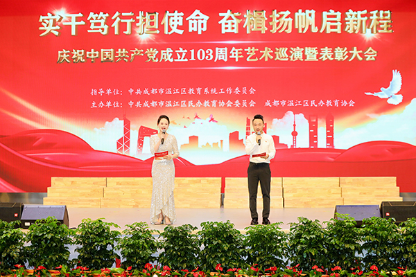 新时代呼唤新担当,新征程铸就新辉煌。6月28日上午,成都市温江区民办教育协会于新世纪光华学校隆重举办了“实干笃行担使命 奋楫扬帆启新程”为主题的庆祝中国共产党成立103周年艺术巡演暨表彰大会。此次盛会汇聚了温江区教育局、温江区教育局机关党委、温江区教育局民职教科、温江区教育局民办教育中心、温江区教育局德育和体艺卫科、温江区残疾人联合会等领导,温江区民办学历学校的书记和校长出席本次活动,全体党员及入党积极分子共襄盛举,共同纪念党的华诞,并对中共成都市温江区民办教育协会委员会在2023年涌现出的先进基层党组织和优秀共产党员进行了表彰。