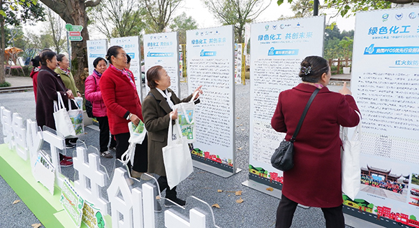 随后,参会群众移步至“绿色化工 共创未来”PFOS成果展参观区域,展区通过图文并茂的展板和实物展示,生动展现了PFOS的研究历程、管控成效以及替代产品的研发与应用情况。参会群众边走边看,不时驻足交流,对PFOS的危害及环保措施有了更加直观和深刻的认识,整个展览现场充满了浓厚的环保科普氛围。